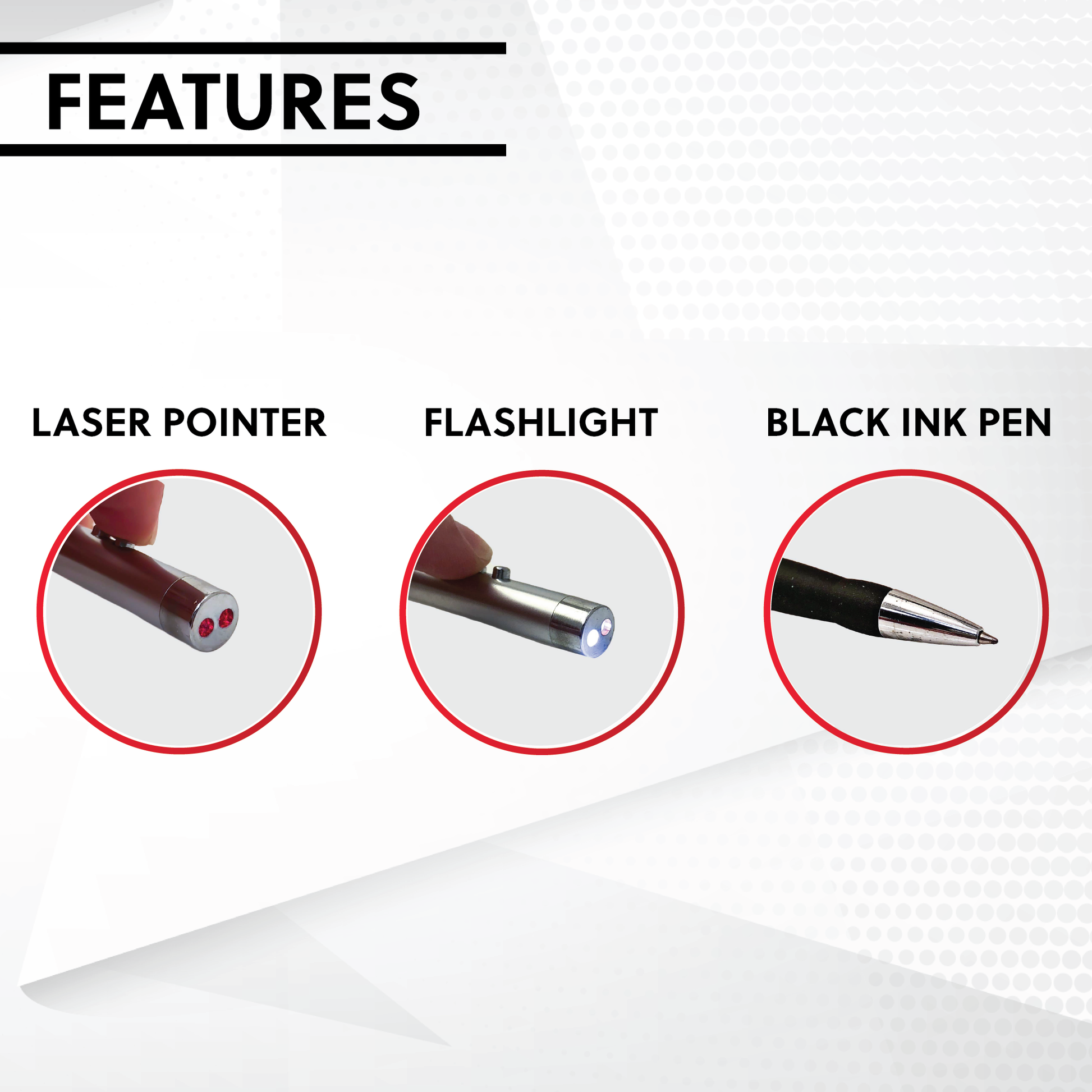 - Integrated Red Laser Pointer, LED Flashlight & Black Ink Pen